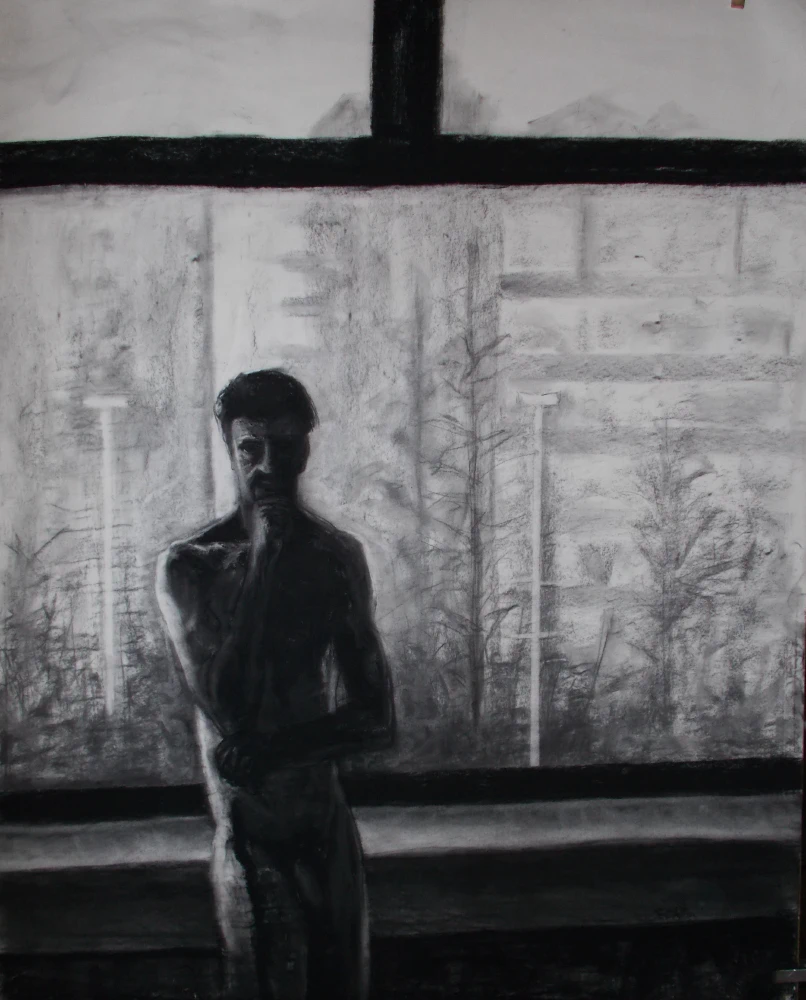 Mannelijk model Martin staat voor het raam van de klas, dromend over...