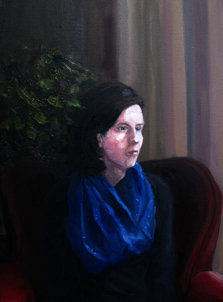 Mijn vrouw Geke zittend in een rode zetel...